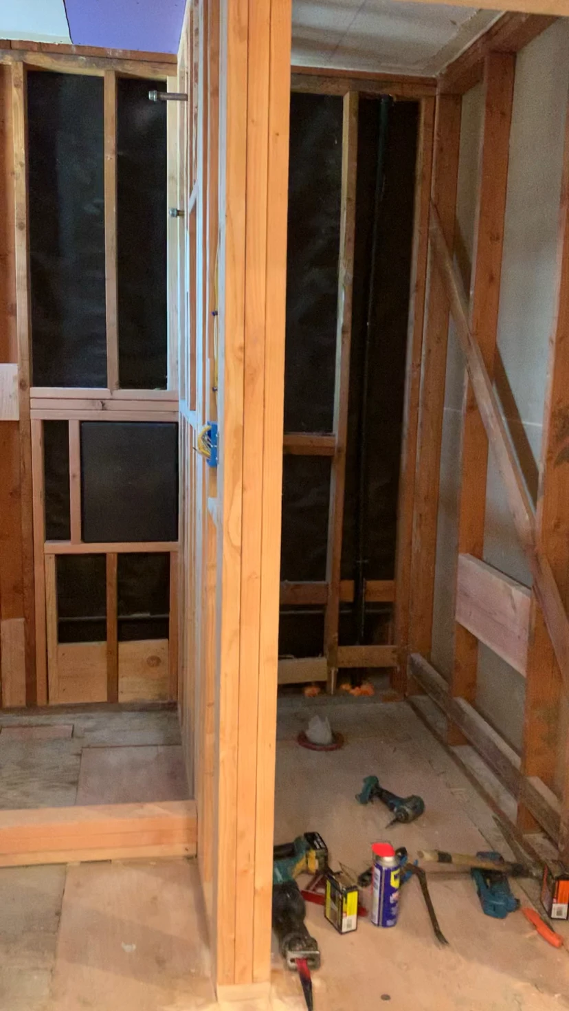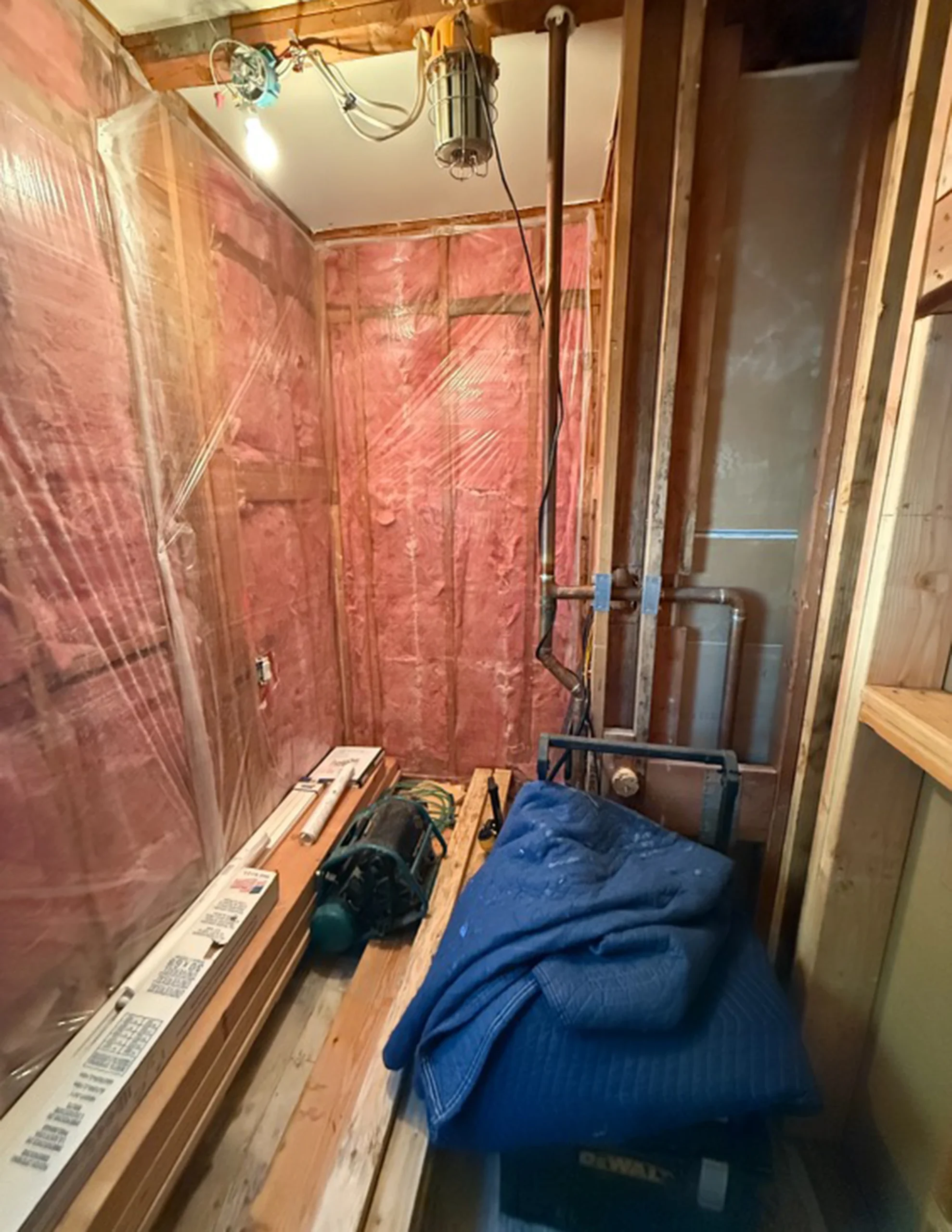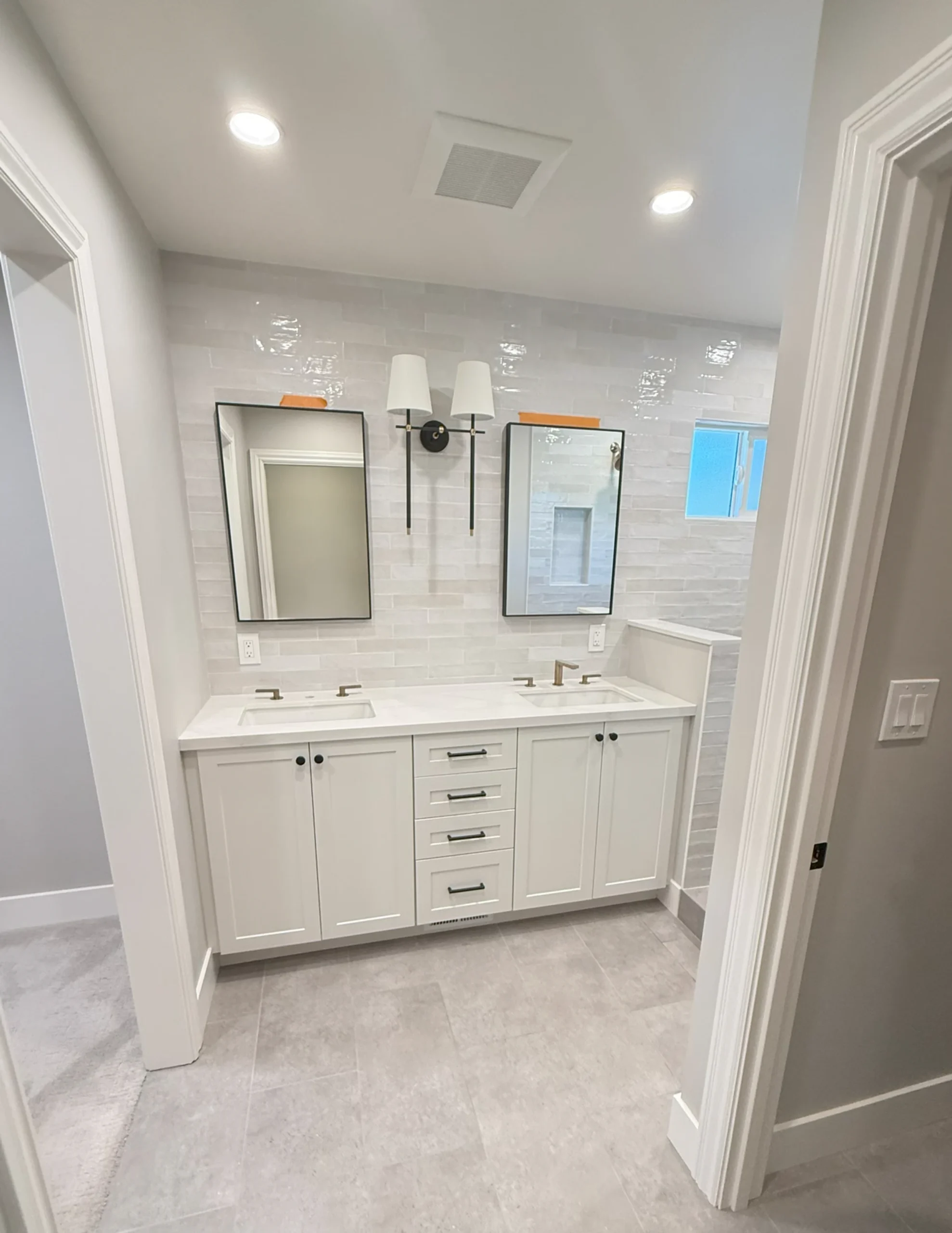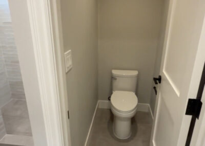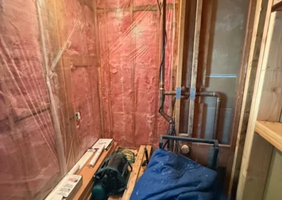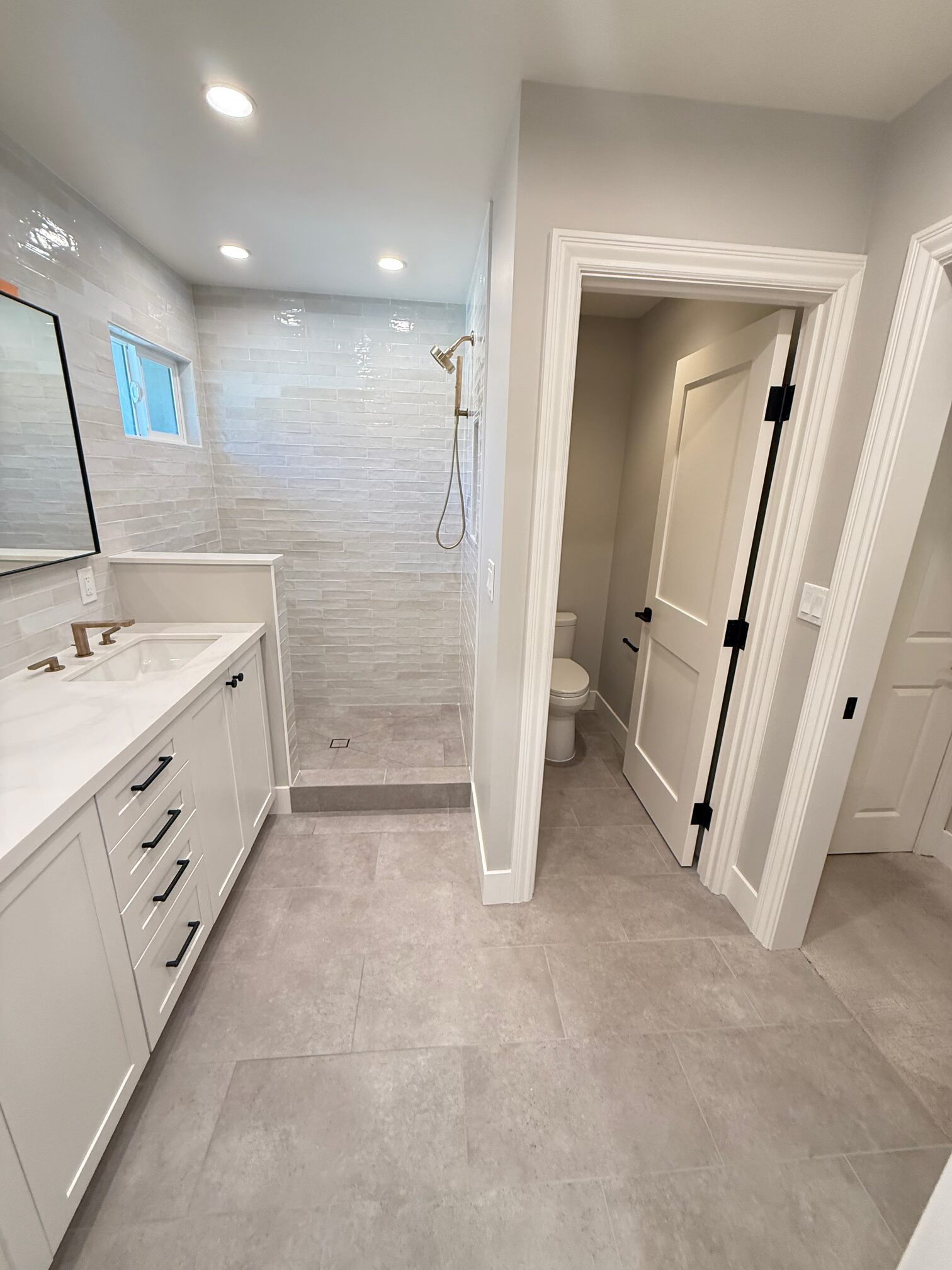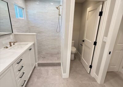 The work began with a full demolition, removing existing fixtures and drywall where necessary, and altering window placements to redefine the layout. We reframed openings for the shower enclosure, closet, and bathroom doors, including the installation of a new sliding door. Plumbing systems were reworked to accommodate the new design, relocating drains, vents, and supply lines. Electrical components including outlets, switches, and light fixtures were repositioned to fit the updated structure. HVAC upgrades included a modern exhaust fan and ceiling vent outlet for improved ventilation.